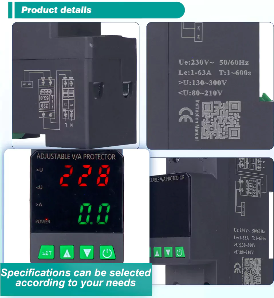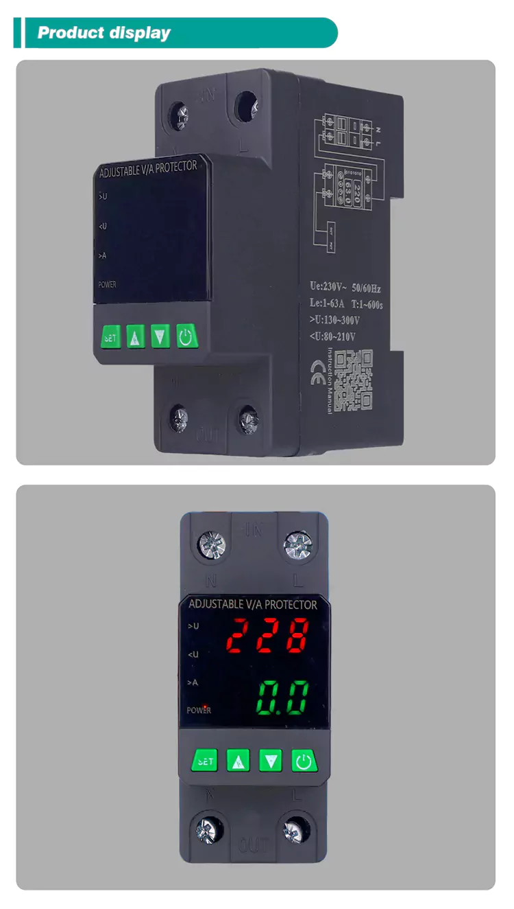 Echipat cu un afișaj digital și fabricat cu componente electronice modulare importate, are o fiabilitate și performanță ridicată. Protectorul taie automat și rapid sursa de alimentare în timpul tensiunilor anormale (cum ar fi supratensiunea, subevaluarea sau fluctuațiile rețelei) și restabilește sursa de alimentare după ce tensiunea revine la normal.